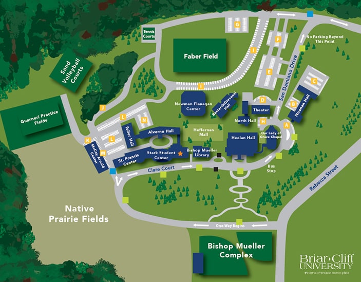 Use the map below to get a high-level overview of our main campus or to help you navigate while you are here. To improve safety and parking opportunities, and to better facilitate the flow of traffic, the campus drive is one-way (marked with white arrows below). Therefore, if you are not heading to a game in Newman Flanagan Center or on Faber Field, we recommend accessing campus using the south entrance by the Bishop Mueller Complex. This allows all campus visitors and guests to easily park in the designated areas and access the Office of Admissions in the Stark Student Center, the Roth Cliff Shop in Heelan Hall, and all the administrative and financial support services in Noonan Hall. The only thing you can't see below is the elevation that makes our clifftop location so unique!