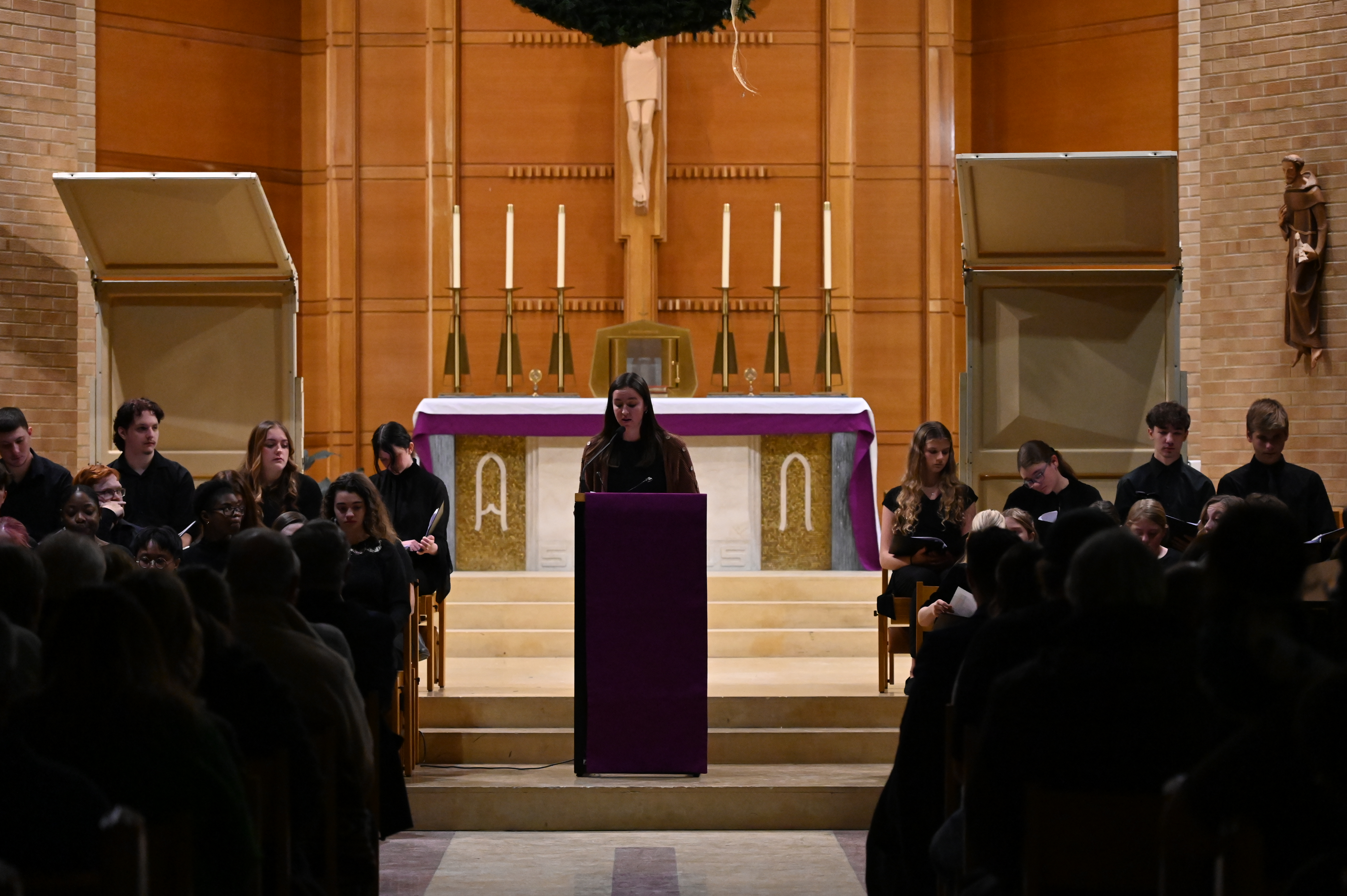 The service blended scripture, prayer, and music to explore the Christmas story through a Franciscan lens. Audience members gathered in the glow of candlelight as the combined voices of the Cliff Singers and the homeschool community choir, Sing for Joy!, filled the chapel with traditional hymns and carols. The program also featured a movement from C.P.E. Bach’s Magnificat and a powerful spiritual by William Dawson.
